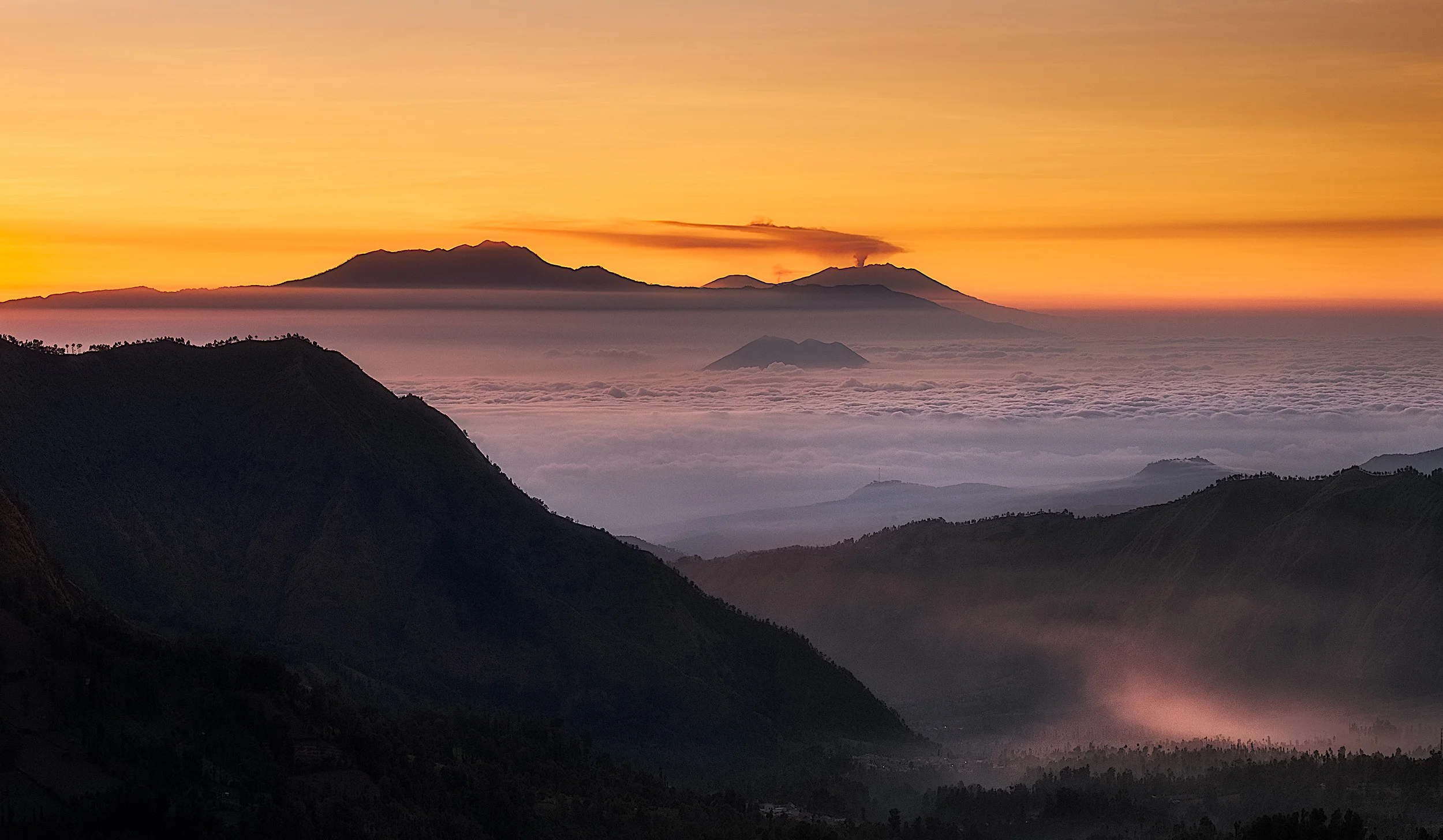 The place got busier and busier as sunrise got closer and the magnificent view of volcanos and mist filled caldera became clearer and clearer. As it got lighter I started the GoPro, which was attached to the side of my tripod, doing a timelapse. The scene became more and more amazing, and with the X-T1 on the tripod shooting the changing light in the scene in front, I used the X-T10 with the 55-200mm to shoot the scene to the east where the sun was rising above an ocean of cloud, through which the volcanos Gunung Lembongan, Gunung Argapura and Gunung Raung appeared like an islands.