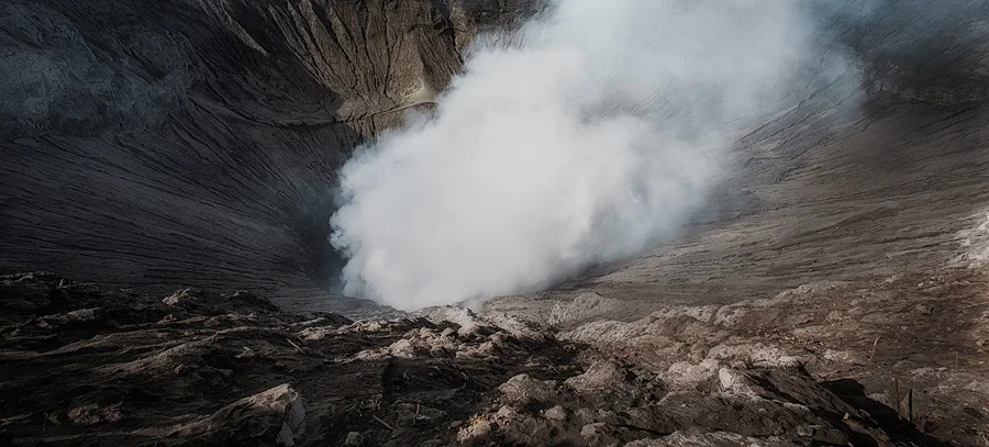 The driver then headed down to the dust filled caldera floor and dropped us off at the base of the smoking Bromo crater. Despite our tiredness we decided to walk as its not often you get the chance to look directly into a smoking volcano. There were hundreds of people there, all making the same climb as us, and lots of local villagers with horses offering rides up the side of the crater. It's an easy, but steep walk before a final stone staircase takes you up to the very edge, and the biggest problem is the heat and dust. It's worth it though, gazing down into the crater belching sulphur smelling smoke is pretty cool although it's not somewhere you want to linger.
