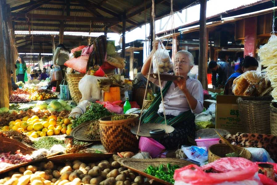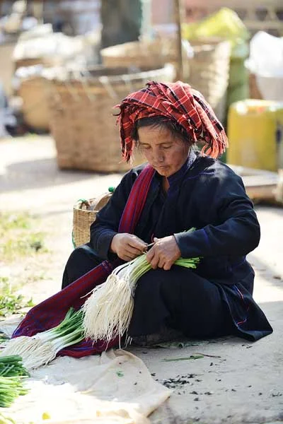 Indein market takes place behind the large pagoda in the town. At first, we were a little disappointed as all the stalls seemed to be selling souvenirs for tourists and for the first time in Burma we felt a little hassled with pressure to buy something. However, a short walk behind the tourist stalls led us in to the market proper, a huge expanse of stalls selling everything from food to blankets, and attended by locals from all the surrounding tribes. The sheer volume of people and the colors of the clothes and produce was almost overwhelming at first. There were very few tourists here, and the locals were for the most part much more interested in buying and selling than they were in us. We soaked it all in, and after a while started to speak to people to ask permission to photograph them while they were working. People almost always smiled and said "yes" and we were able to take some nice portraits of the various people at the market.