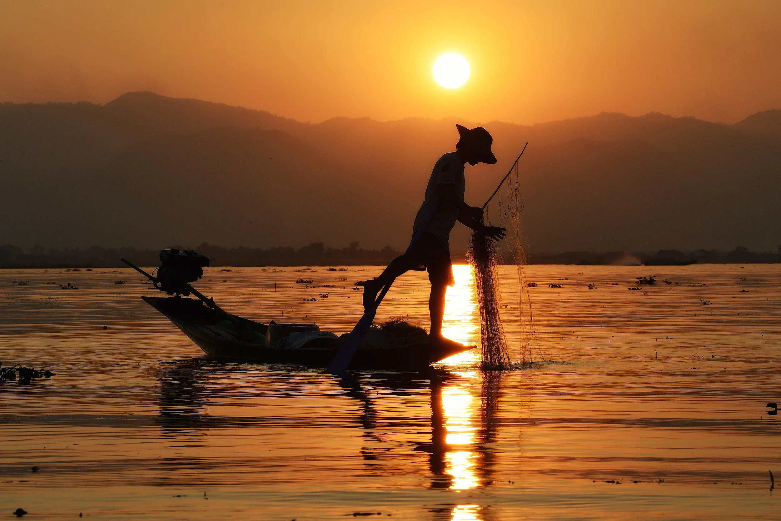 We passed 45 minutes as the sun got lower in the sky and eventually dropped behind the peaks that surround the lake, talking photos of the fishermen as they worked, and while it was a lovely evening, and I was happy with many of the shots, I was disappointed that we hadn't seen any of the basket fishermen, who are also unique to Inle. Our guide told me that the basket fishermen usually worked around the north of the lake, as the water where we were was too deep for that particular technique, so we agreed to meet before dawn the next morning and head there in the hope of finding some.