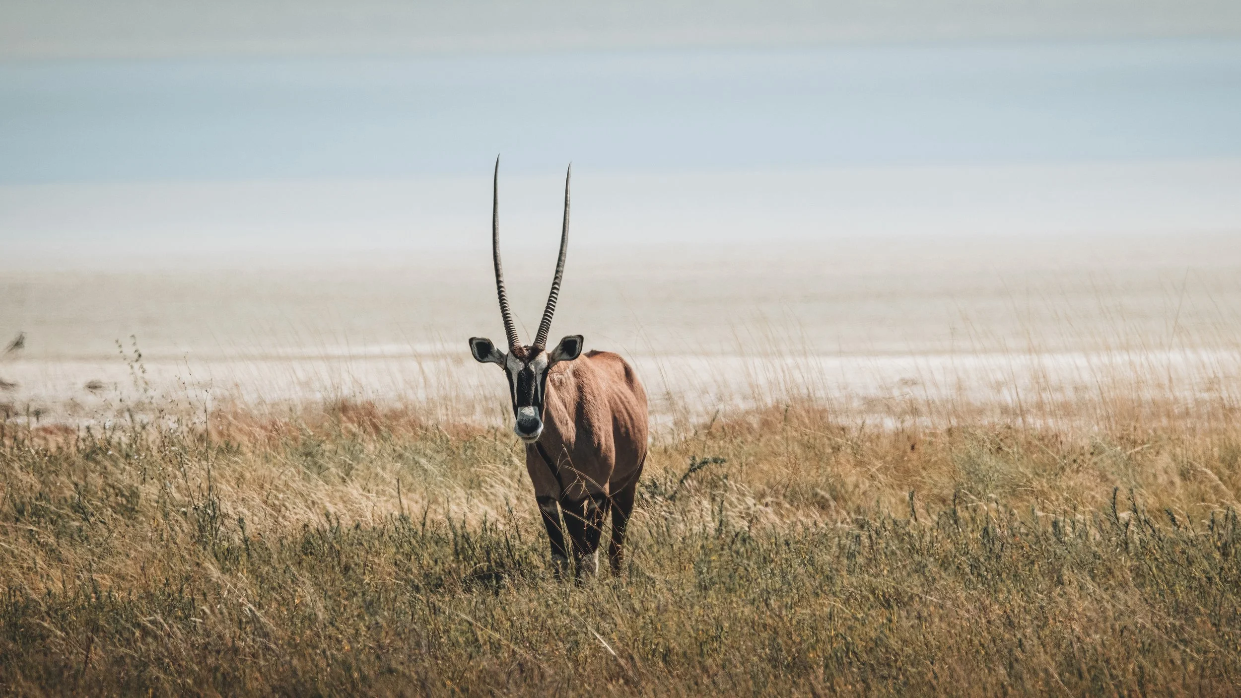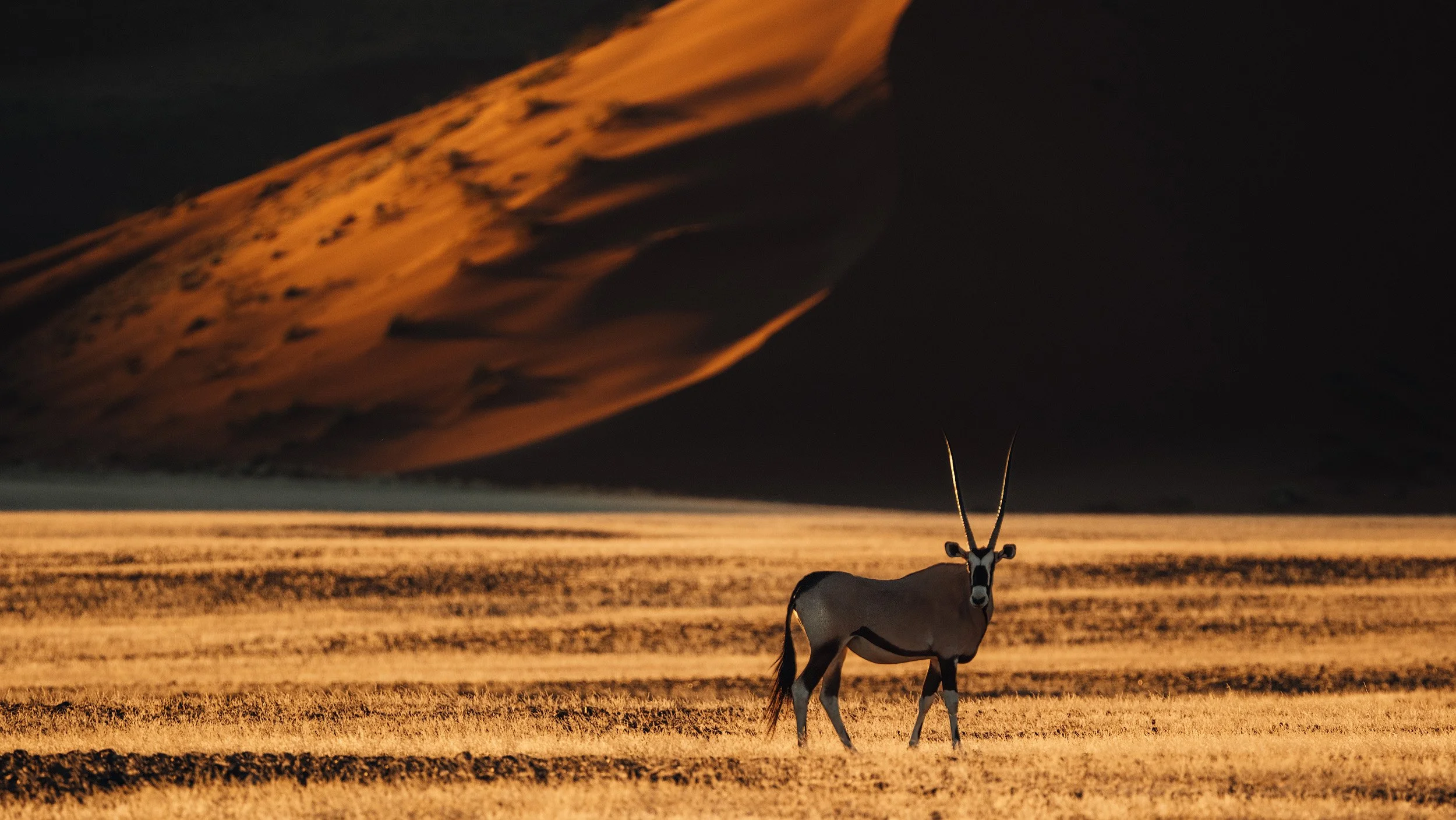 An Oryx wanders though the grass of Sossusvlei in the last light of da