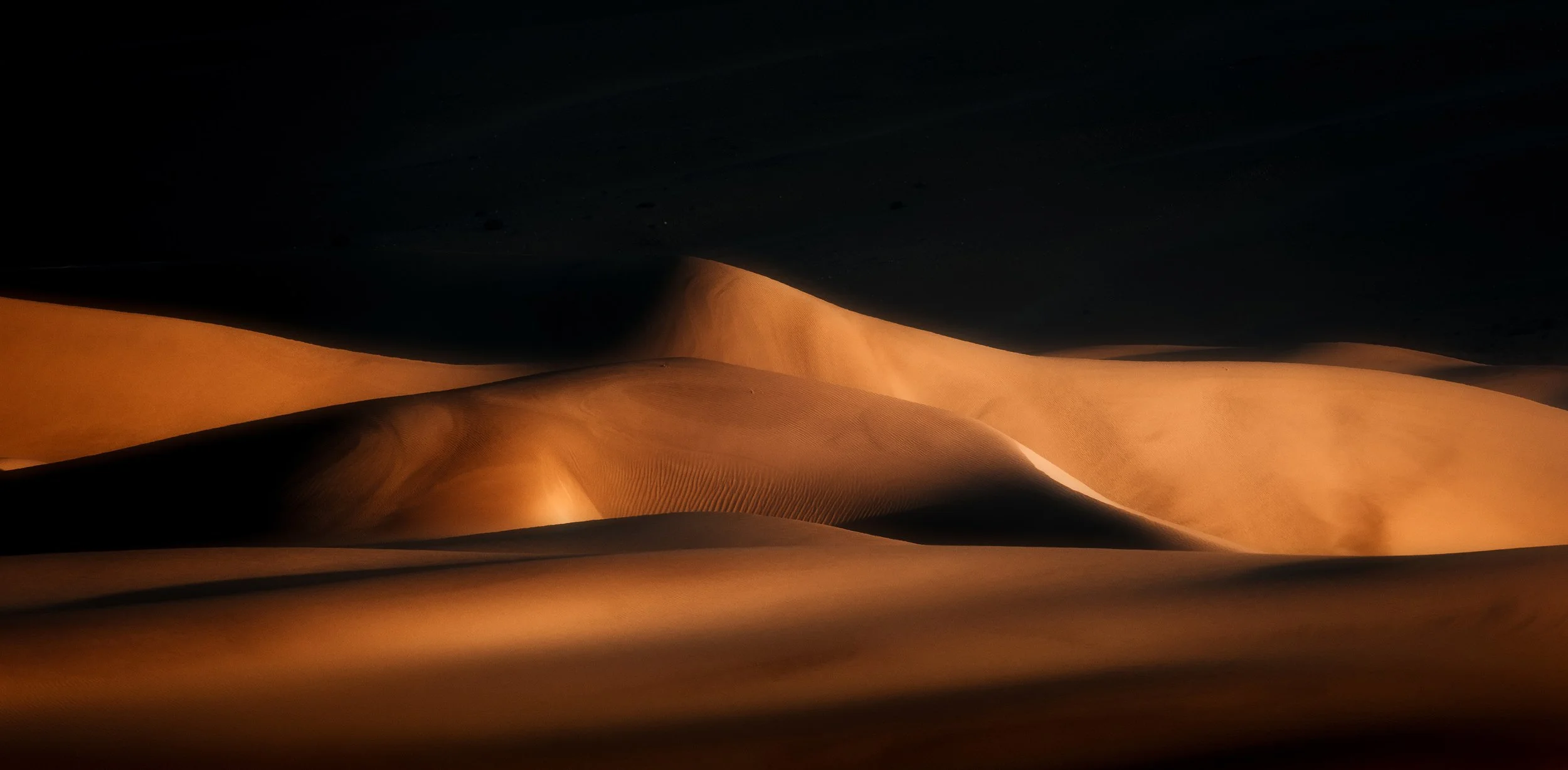This is an unusual scene in that generally the dunes here are captured facing the spine of the dune with strong contrast as the sun lights up one side and leaves the other in shadow, but this scene in the last light of day is shot directly into the light, reducing the contrast and leaving the wind-shaped contours on the side of the dunes barely visible.
