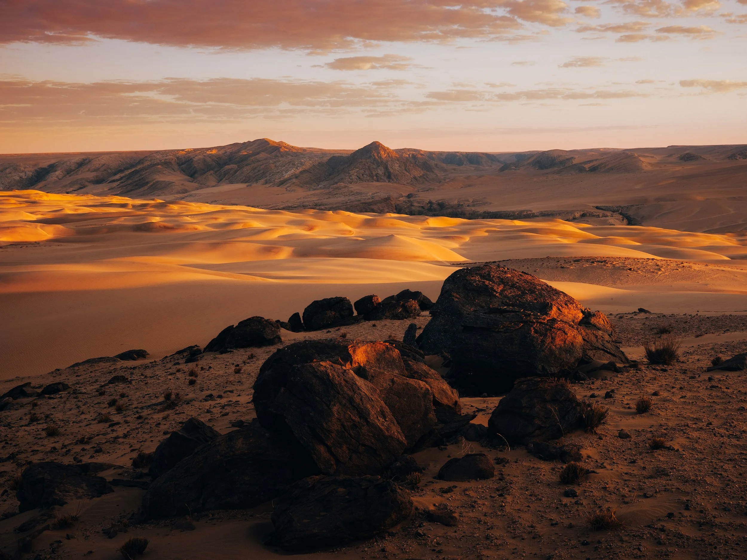 Late light across boulders deep in the desert wilderness of the Skeleton Coast