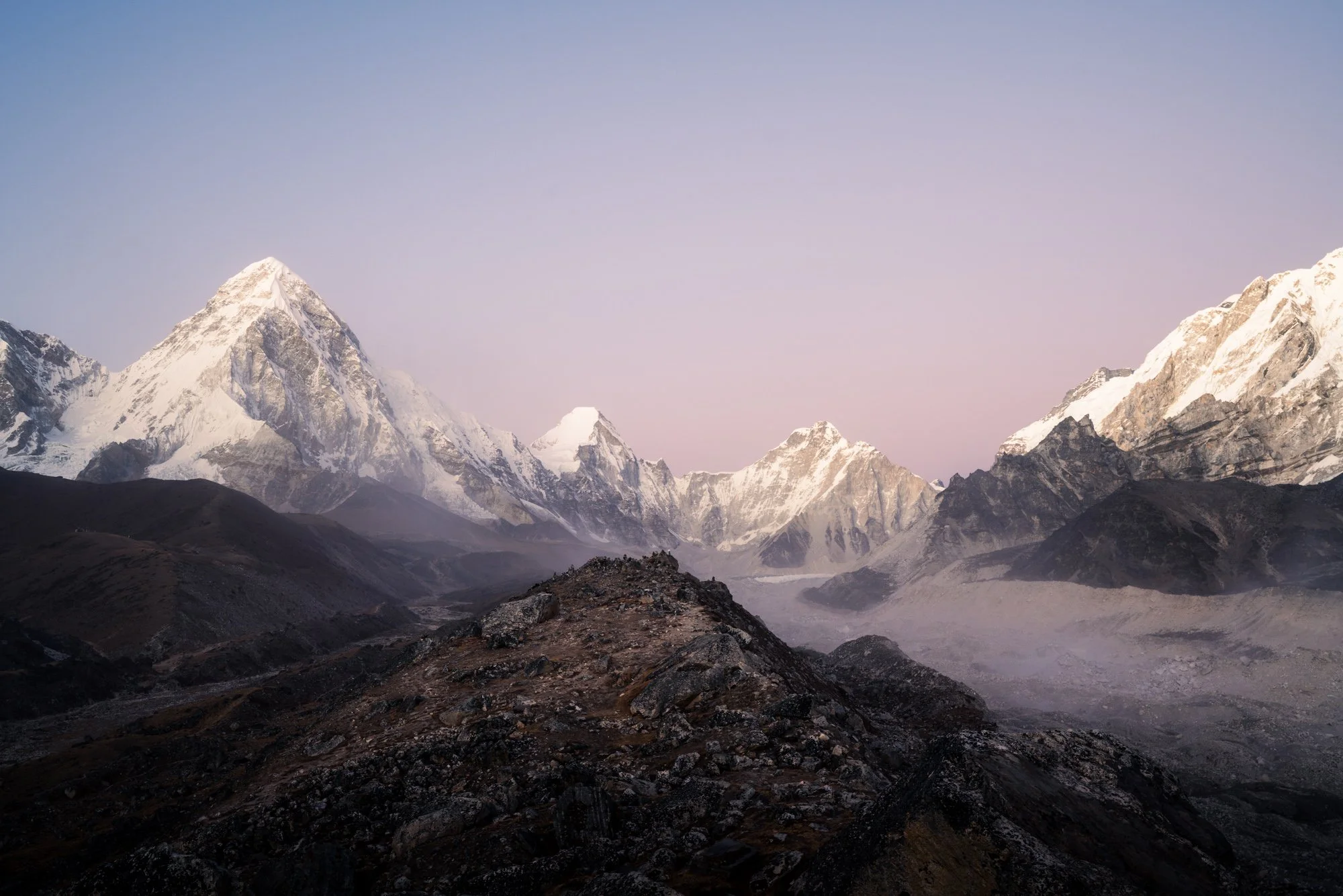 A landmark day. We trek to Gorak Shep, leave our main packs, and continue toward the summit of Kala Patthar for a spectacular sunset views of Mount Everest. The terrain is rugged and glacial, with constant views of the Khumbu Icefall below. As the sun sets, Everest and the surrounding peaks ignite in shifting light. We descend back to Gorak Shep under headlamp, tired and exhilarated.