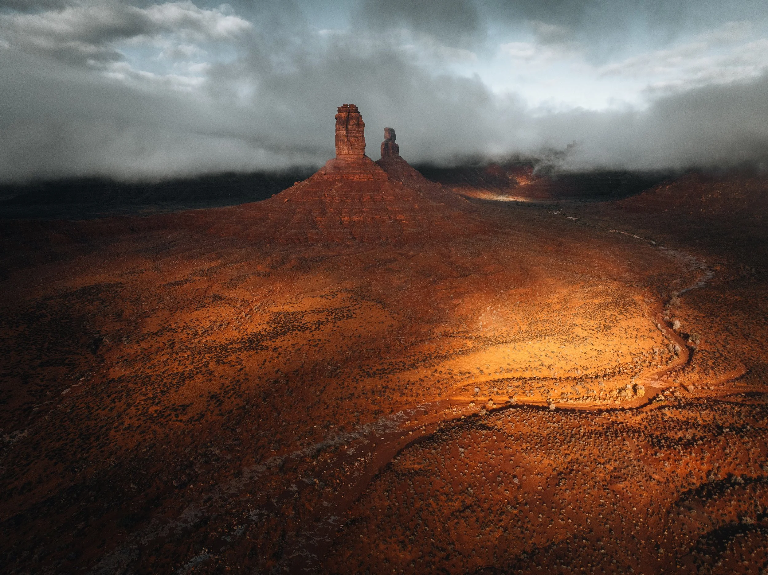 Cloud descends and sits low on the mesas and buttes of Valley of the Gods in southern Utah